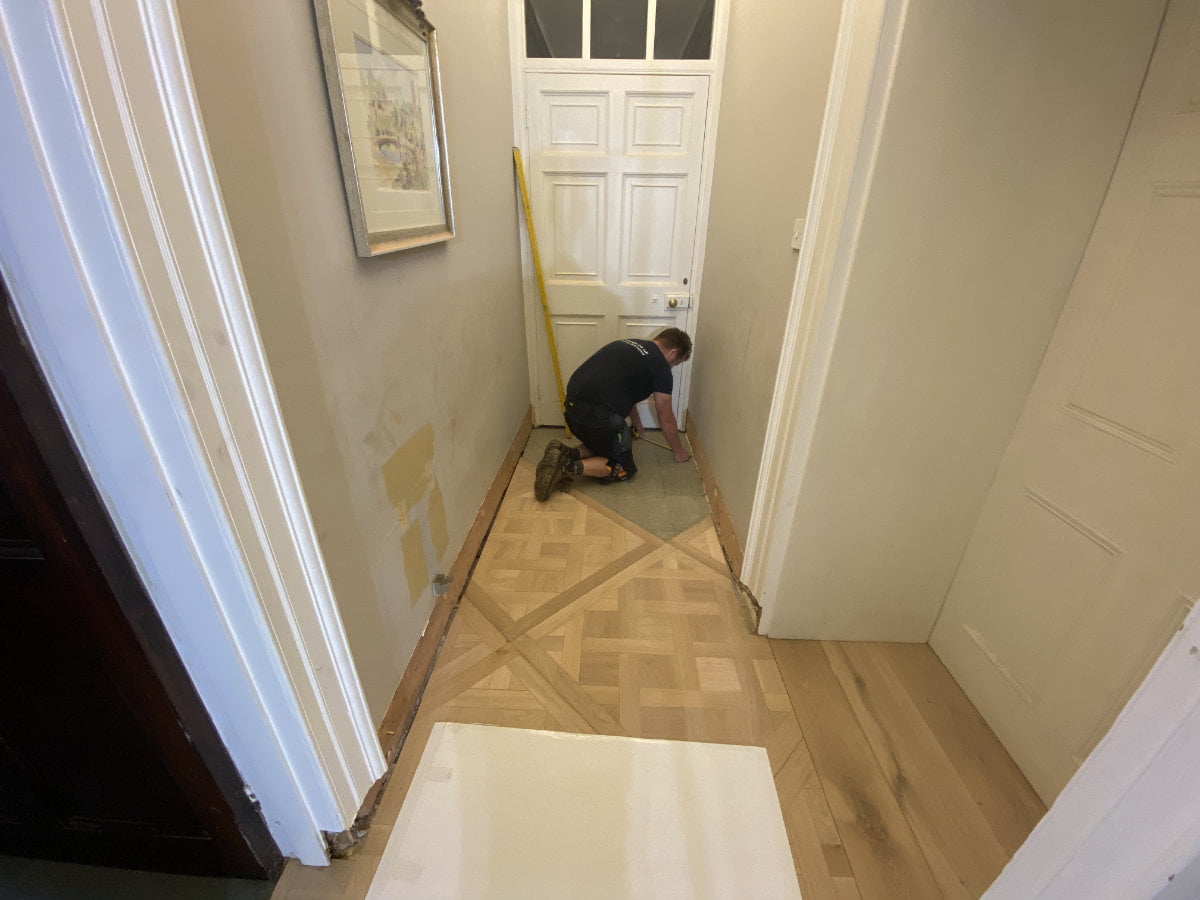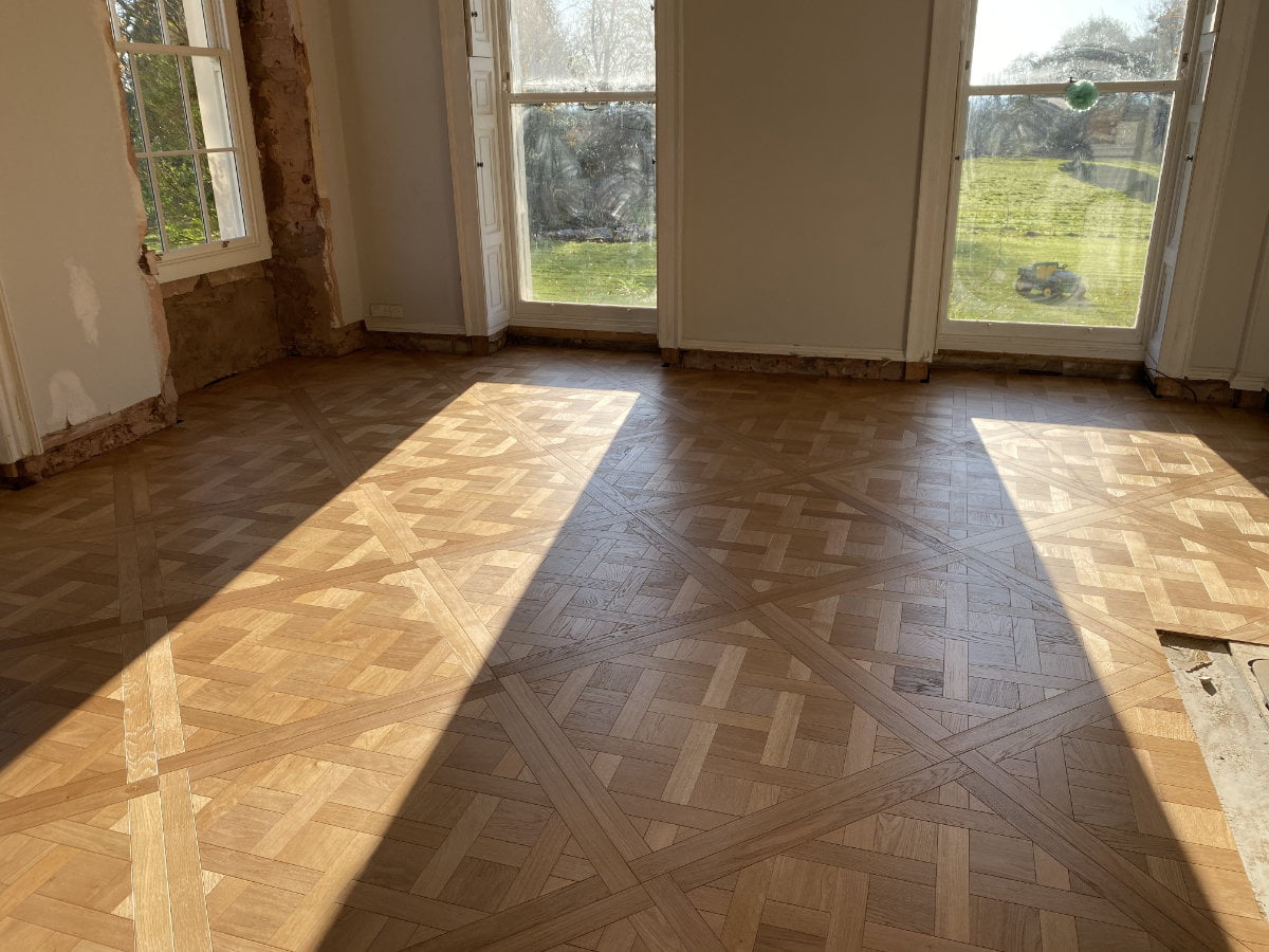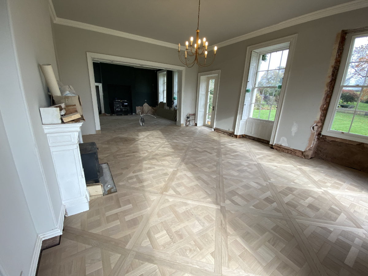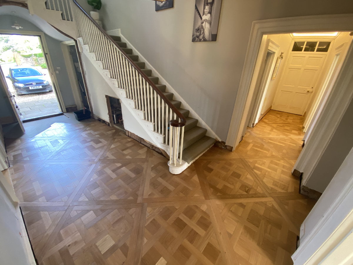 We fitted Oak Versailles panels in the kitchen/dining room and hallway in this stunning 17th century rectory. The panels, named after the famous Palace of Versailles (Château De Versailles) in France, were stuck down to the subfloor using MS polymer adhesive. Once fitted we finished with Morrells Induro XLO hardwax oil, which helps to preserve the colour and feel of the wood.